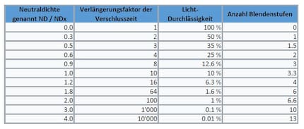 Have you ever wondered what all those filter terms and names mean? Here’s a table for your overview. Hoya names filters after the lengthening factor of shutter speed, most other filter brands, however, name their lenses after their optical density (ND or NDx). This table also shows by how much the shutter speed is extended, how high the fractional transmittance of each filter is and what the effect is on the focal ratio.