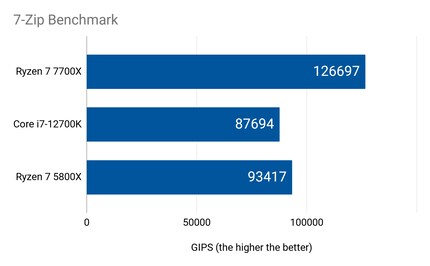 The 7700X is clearly ahead of the 12700K with a 44 per cent better result. Not really surprising, as the latter is already slower than the indirect Ryzen predecessor.