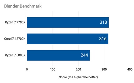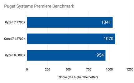 Traditionally, Intel CPUs perform better in Premiere because they’re optimised for it. Same goes for Ryzen 7000 processors. However, the 7700X is just barely behind: it only scored three per cent less than the 12700K. Compared to its predecessor, there’s a nine per cent increase.