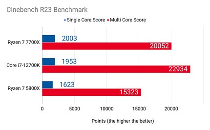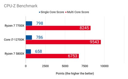 The 7770X outperforms the Intel 12700K by 1.5 per cent in single core. Thus, the new Ryzen CPU is 21 per cent better than its direct predecessor, the 5800X. However, the Intel chip is 14 per cent better in multi-core due to the four additional threads.