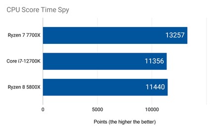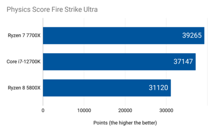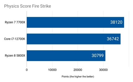 Across the four benchmarks, the 7700X scored five per cent higher than the 12700K. Only in Time Spy Extreme did it have to admit defeat. Compared to the previous CPU, it’s even 24 per cent better.
