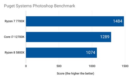 In Photoshop, the 7700X makes a huge leap forward compared to its indirect predecessor. A score is 38 per cent higher than that of the 5800X. Regarding the competition, it’s a noteworthy 15 per cent on top of that.