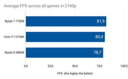 Across all resolutions, the 7770X delivers more FPS than the competition and its indirect predecessor. As expected, the differences became smaller at higher resolutions. At 1080p it was 6.5 per cent, at 1440p four per cent and at 2160p two per cent when compared to Intel’s 12700K. Compared to its indirect predecessor, the AMD 5800X, that’s 14.5, nine and four per cent.