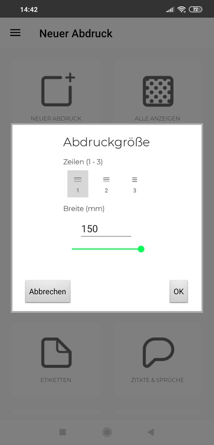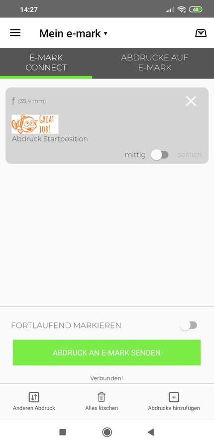 For this to work, I first have to activate the beeps on Vader again. They tell me when the print is ready and I have to switch to the next line. Before I can print, I have to send three impressions to Vader and select the "Continuous marking" option.