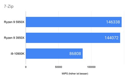 In the integrated benchmark of 7-Zip - I choose the standard "Dictonary size" of 32 MB - the difference to the predecessor is smaller: the 5950X manages just over 2000 instructions per second (MIPS) more, which corresponds to 1.5 per cent. AMD leaves the competition from Intel far behind with this result, but this is due to the six more cores.