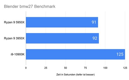 The performance increase in Blender compared to its predecessor is also manageable. AMD's new top model renders the benchmark scene one second faster than its predecessor. Compared to the Intel, the 5950X is 27 per cent faster.