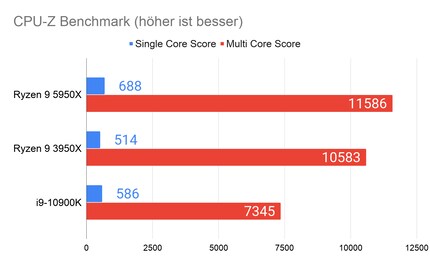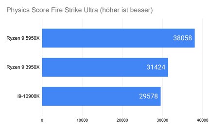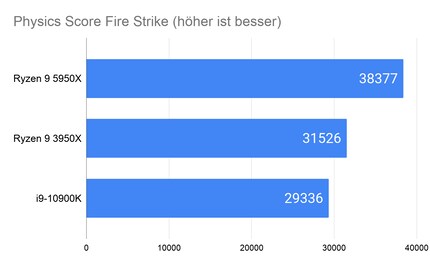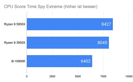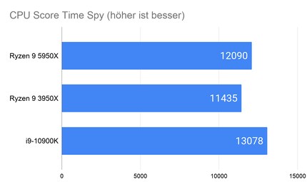 In three benchmarks, the new AMD top model leaves the competition from Intel far behind. In Time Spy, however, Team Red remains behind Team Blue. Over the four benchmarks, however, the 5950X is around 24 per cent ahead of the 10900K. Compared to its predecessor, the 5950X still performs around 18 per cent better.