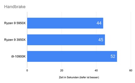 The difference between the 5950X and 3950X in the Handbrake test is also only one second. The 5950X encodes the 88-second, 645 MB 4K trailer of "The Dark Knight Rises" around two per cent faster with Handbrake's "Fast 1080p30" presets. Compared to the 10900K, however, it is around 14 per cent faster.