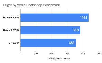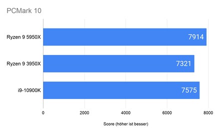 The 5950X is eight per cent better than its predecessor in the PCMark 10 benchmark. This tests various office scenarios such as the loading time of apps, efficiency in spreadsheets, browsing or photo and video editing. It calculates a score from this. Compared to the 10900K, the test CPU is four per cent ahead.