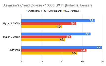 As you can see, the Ryzen 9 5950X performs similarly to the 10900K in almost every game and resolution. The exception is "Strange Brigade". The game generally runs worse with AMD processors than with Intel processors. I therefore exclude it from the presentation of the average FPS. However, the game shows that Intel is still favoured by certain games.