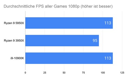 In 1080p resolution, the difference between AMD and Intel is just one FPS. The 10900K is therefore not even one per cent more powerful than the 5950X in games. In 1440p, the difference is two FPS, which corresponds to around two per cent. At 2160p resolution, the two are on a par.