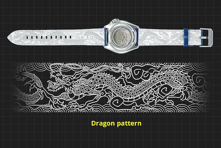 The watch strap is made of blue calfskin on the top, while the inside features a dragon pattern – apparently the same one as on Chun Li’s decorative belt. But according to me, this very belt has been white since the 1990s. Does anybody know more about this? Does it have this print in Street Fighter V, which is what the watches are based on?