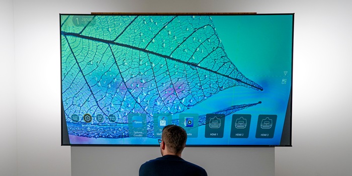This is exactly why ultra short throw projectors (UST projectors) such as Optoma’s UHZ65UST are so popular. UST projectors can be placed almost directly underneath the canvas and project the image onto the screen from below instead of from the front. External playback devices sit next to the screen, as they would with a TV, and not in the middle of the living room. As a result, nobody can block the image. To add to the magic: although the projector is so close to the canvas, it creates a large image. 100-inch screen diagonal and more.