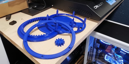 First, I print out the platform. It consists of six parts and includes a gear mechanism. Thanks to my 3D printer Creality CR-10S Pro, the parts are printed in just over eight hours.