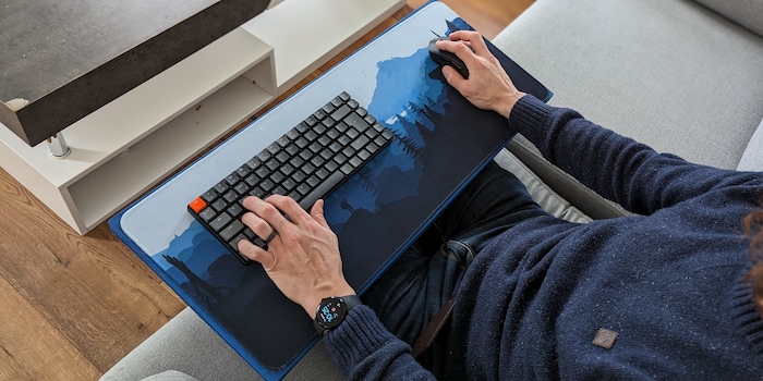 For the keyboard, I went with the Keychron K3, a compact model with mechanical low-profile switches and key caps. Although it only has Bluetooth and no Wi-Fi dongle, I didn’t notice this resulting in more significant input lag, even in online shooters. I only added the Velcro for testing. It’d certainly work – the keyboard stays on, even when the lapboard is tipped forwards. This puts the keyboard at a steeper angle, but even in this position it stays perfectly in place during typical use.