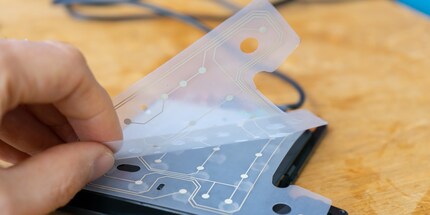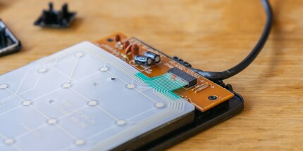 Membrane keyboards are made up of thin plastic membranes over which electrical wires can be seen running. On this Delock, there are three membranes. The bottom membrane is connected to the printed circuit and the wires run vertically across it. On the intermediate sheet, which is connected laterally to the upper sheet, the wires run horizontally. They therefore form a circuit. Between the two is a separating film that prevents the circuit from being inadvertently closed. The circuit is closed by pressing on the rubber domes and as the Delock numeric keypad has no controller, the signal is sent directly to the computer.