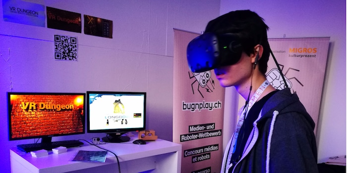 Their project was made possible by Bugnplay.ch – a digital youth competition for games, code, robotics and multimedia held by Migros-Kulturpozent. For his first VR game “FindJ”, Jeremias won the GameAward in 2016. This was followed by a trip to Linz, where he laid the foundation for “VR Dungeon” together with Zsombor. In the course of a cooperation with Ludicious, the two teenagers were sent to the game festival in Zurich, where they were given their own stand and the opportunity to give a presentation on their project.