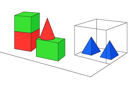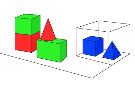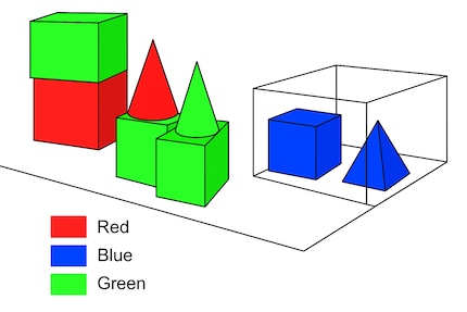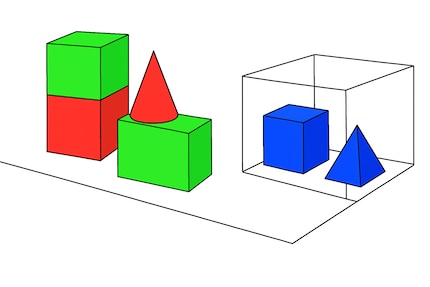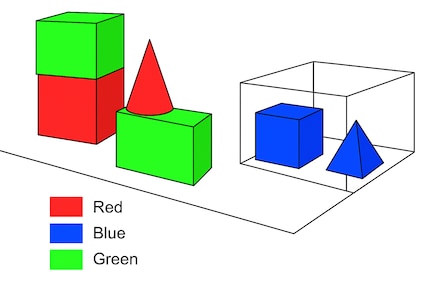 Liegt der grüne Klotz unter dem roten Kegel oder neben dem roten Kegel?