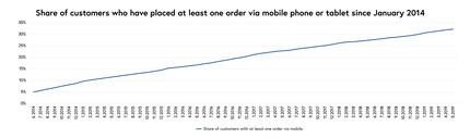 Show allWe carry it around in our pockets or handbags, take it with us to the toilet, have it next to as at work or in bed – and we use it to make online purchases: in the last few years, the share of mobile shopping has increased rapidly on digitec and Galaxus. Today, more than a quarter of all purchases are made from a smartphone. With purchases via tablet at 8%, mobile shopping now represents more than a third of all purchases (see chart). To put this into perspective: at the beginning of 2014, 99 percent of all online purchases in Switzerland were made via desktop or laptop.