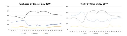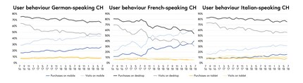 There are also large differences in online shopping behaviour in Switzerland depending on the time of day and the day of the week. While most visits and purchases are made from a computer during Swiss office working hours (8 a.m. to 5 p.m.), mobile shopping spikes during lunch hours. Mobile phones now play a major role in online shopping at breakfast, on the way to work and on weekends.