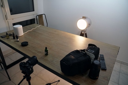 All I needed in the end were two lamps: The spotlights on the ceiling and the standard lamp from my bedroom with Philips Hue Smart Lights. The camera was sitting on a video tripod.