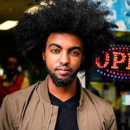 Birhane in front of a hairdressing salon in FootscrayIf you haven’t plucked up to courage to talk to complete strangers in the street yet, this might be an idea: Try easing yourself into the task by asking staff in cafés, shops and restaurants for their portrait. This tends to be easier as you’re usually already talking to these people.