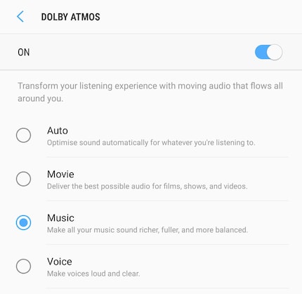 You have to adjust the Dolby Atmos settings otherwise your music will sound strangeIf you don’t alter the Dolby settings, it’s so much harder to enjoy the music. That’s why I recommend going to the Dolby Atmos menu in Settings and selecting a suitable preset. I chose the «Music» option, as I mostly use the audio on the S9+ for listening to music.