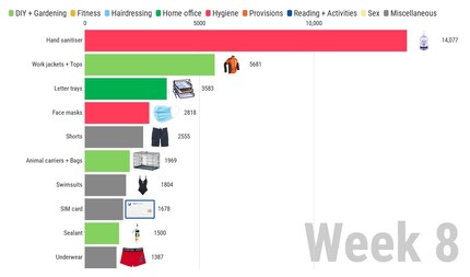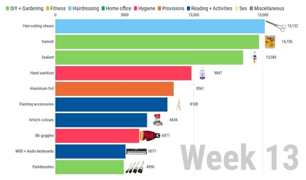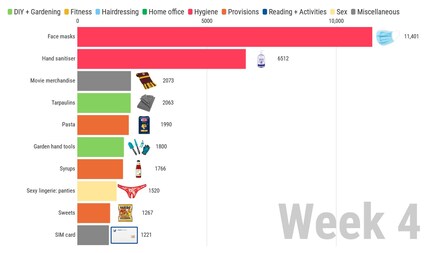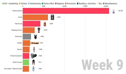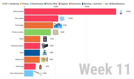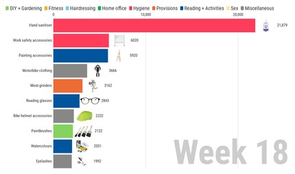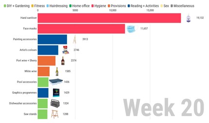 The Corona pandemic has completely changed the way we shop. Our animated bar chart shows how the demand for face masks, gardening tools or home office equipment has developed since the beginning of this year.