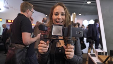Along the way, video producer Stephanie Tresch finds one of her highlights of the Mobile World Congress: a modular system for building smartphone rigs. She has to test it right away.