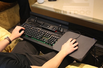 Let's start with the monster. The Corsair Lapdog is gigantic. The part is over 70cm long. But it also offers a huge, high-quality mouse tray. The Lapdog is actually a table - simply made of plastic and without legs. It offers space for a full-size keyboard - including a numeric keypad. The top end can be folded open to store cables. It also has six (!) USB 3.0 ports. Two are underneath the mouse pad for the mouse and keyboard, while the others are outside for a headset or USB fan.