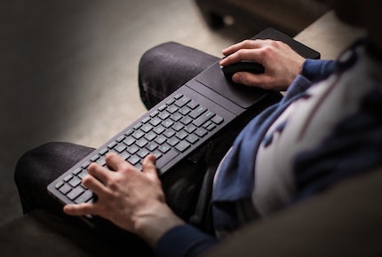 This brings us to the third sofa solution in the group. The smallest, but in my opinion, the finest. The Razer Turret is the only one that is wireless and comes with a matching charging station into which you can plug the keyboard and mouse. It takes up little space and looks stylish. If the battery does run out, you can also use a USB cable. The Razer Turret is a foldable keyboard with an integrated mousepad. Compared to the options from Roccat and Corsair, everything is significantly smaller. So you don't have much room to navigate with the mouse. Nevertheless, Razer's version can be controlled relatively comfortably from the thighs.
