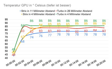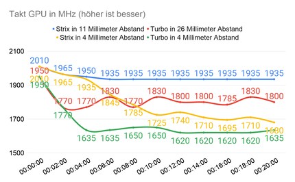 The Strix also performs better with the four millimetre gap. The one decibel difference is the equivalent of eleven per cent that the Turbo is louder than the Strix. The Strix also wins in terms of temperature. After 20 minutes, both are 86° Celsius warm. However, the Turbo reaches this limit earlier: after just four minutes. The Strix takes ten minutes longer. The drop in performance is enormous for both: the Strix clocks down by almost 20 per cent. With the Turbo it is 19 per cent.