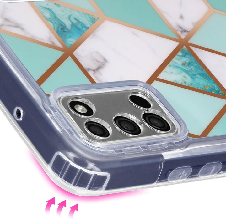 Geometric case with marble pattern for Samsung A03s / A02s. Hard back combined with a transparent flexible contour and reinforced shockproof corners. Ports are accessible and buttons are redesigned. Raised edges for the screen and camera.
