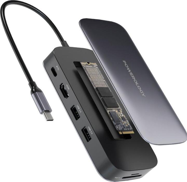The most innovative feature of this product is its built-in solid-state drive (SSD) with a capacity of up to 256 GB, which handles data storage. The Powerology 256 GB USB-C Hub and SSD drive also support SATA storage interfaces, expanding possibilities and enabling efficient data storage and access.