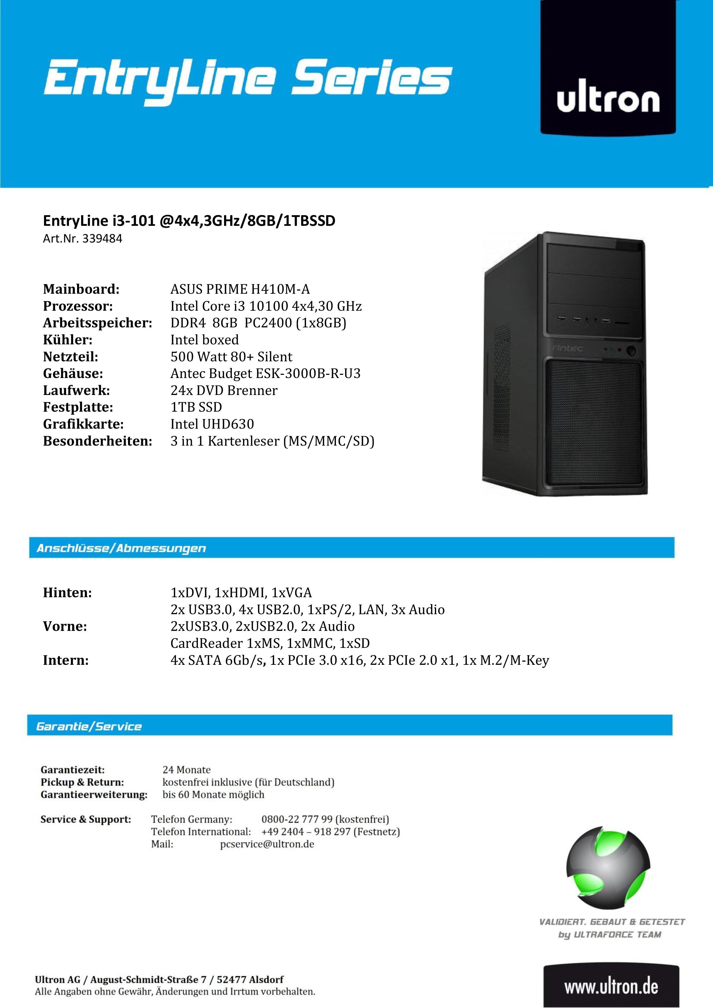 The Ultron EntryLine is a powerful desktop PC equipped with a 10th generation Intel Core i3-10100 processor. With a clock speed of up to 4.3 GHz and four processor cores, this system offers solid performance for everyday applications and multitasking. The PC features 8 GB of DDR4 RAM and a 1 Terabyte SSD, ensuring fast load times and ample storage space for data and applications. The integrated HD630 graphics provide appealing visual representation for office applications and multimedia content. The EntryLine is designed in a compact tower format and offers a variety of connectivity options, including USB 3.0, HDMI, and DVI, to ensure flexible connectivity. This system is delivered without an operating system, making it ideal for users who want to choose their preferred software environment.