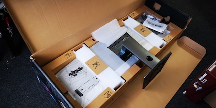 Premièrement, je dois fixer le pied sur le socle. Cette étape me permet de déjà vider le compartiment 1 et 2. Dans le 3e se trouve encore un couvercle VESA et différents câbles et manuels se trouvent dans le 4e. Maintenant, je peux accéder à l'écran, dissimulé sous tous les compartiments. Au dos de l'écran, je visse le pied fixé sur le socle et peux enfin hisser le tout sur mon bureau. Et quand je dis hisser, je le pense vraiment: Tiny pèse plus de 17 kilogrammes.