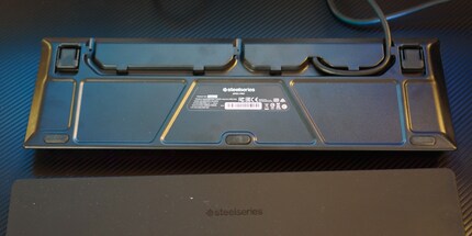 Ajoutons à cela un port USB A à l'arrière gauche. Vous pouvez donc connecter d'autres périphériques, comme un SSD externe, directement au clavier. Pour vous aider à trouver le port, il est éclairé par une LED blanche. L'Apex Pro est livré avec deux câbles de connexion USB-A : un pour le clavier lui-même et un pour le Passthrough. Le câble est donc relativement épais et peut être gênant sur votre bureau. C'est sans doute pour cette raison que Steelseries a décidé de vous permettre de faire passer le câble sous le clavier de manière à ce qu'il sorte à gauche, à droite ou au milieu. Cela permet au moins de cacher un peu mieux le câble du batteur de mort.