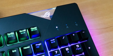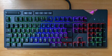 Le clavier d'Asus est équipé d'un éclairage des touches, d'un éclairage du fond et d'un logo ROG illuminé sur une surface transparente. Vous pouvez d'ailleurs remplacer le logo par celui de votre choix. C'est le seul clavier entièrement en plastique qui pèse environ 1256 grammes. Etonnant, car avec ses 45,4 × 15,5 × 3,1 cm, il est plus petit que le Vulcan. Asus fait également claquer les lettres et les chiffres sur les touches dans une écriture grasse et futuriste.