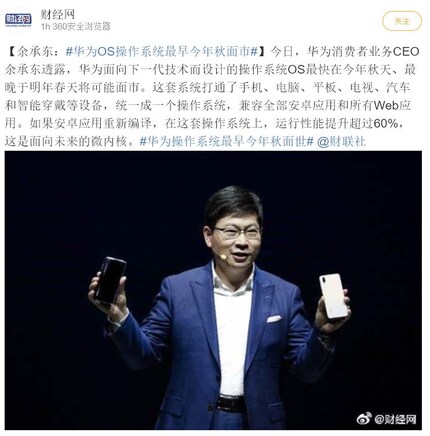【余承东:#华为OS操作系统最早今年秋面市#】今日,华为消费者业务CEO余承东透露,华为面向下一代技术而设计的操作系统OS最快在今年秋天、最晚于明年春天将可能面市。这套系统打通了手机、电脑、平板、电视、汽车和智能穿戴等设备,统一成一个操作系统,兼容全部安卓应用和所有Web应用。如果安卓应用重新编译,在这套操作系统上,运行性能提升超过60%,这是面向未来的微内核。#华为操作系统最早今年秋面世# @财联社