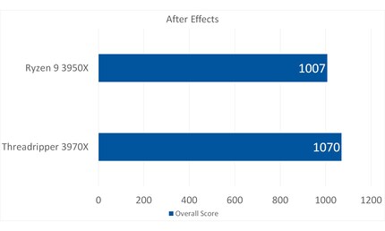 Déjà le 3950X a obtenu des résultats brillants au benchmark After Effects. Avec environ 6 pour cent, le Threadripper 3970X fait encore mieux.