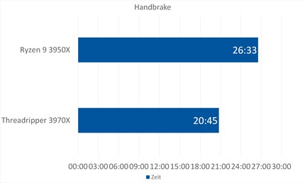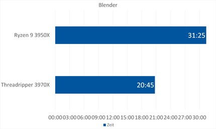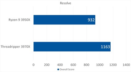 Dans Resolve, la différence avec le Ryzen 3950X est frappante. Le Threadripper 3970X est environ 23 pour cent plus performant. Avec ce résultat, il bat aussi de loin la station de travail de référence.