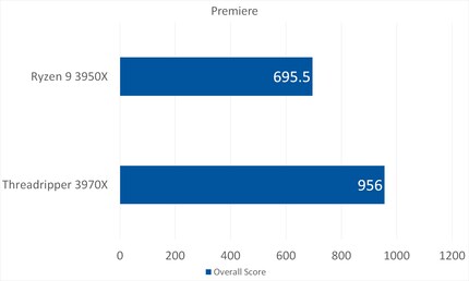 Le Threadripper détruit littéralement le 3950X dans le benchmark Premiere. Environ 27 points de pourcentage de plus, c'est énorme. Et ce, même si la carte graphique combinée avec le 3970X est distancée par rapport au 3950X.