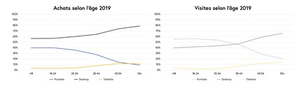 Entre les classes d'âge, les différences de comportement des utilisateurs sont également frappantes : les clients de moins de 35 ans visitent désormais digitec et Galaxus plus souvent avec un téléphone portable qu'avec un ordinateur. La classe 55+, quant à elle, utilise la tablette pour se rendre sur les boutiques en ligne dans un cas sur sept, et le PC, dans huit cas sur dix. En résumé, plus un acheteur en ligne est âgé, plus il est susceptible d'utiliser l'ordinateur et/ou la tablette pour ses visites et ses achats.