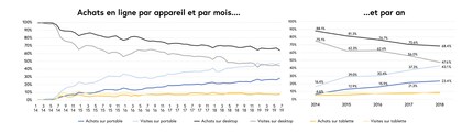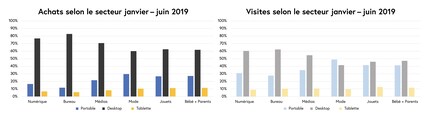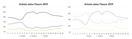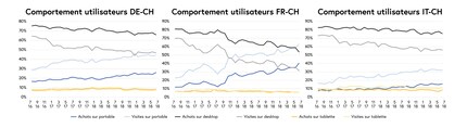 Selon l'heure de la journée et le jour de la semaine, il existe également en Suisse de grandes différences dans le comportement d'achat en ligne. Pendant les heures de travail traditionnelles – soit de 8 h à 17 h –, l'ordinateur demeure l’instrument utilisé pour le e-shopping. Pendant la pause déjeuner, cependant, on enregistre un pic de visites significatif avec le téléphone portable. Au petit-déjeuner, sur le chemin du travail et le week-end, le téléphone portable joue maintenant un rôle très important.