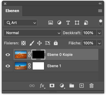 Vous verrez alors une deuxième icône à côté de la vignette du calque : c'est le masque de calque. Il est normalement blanc au début. Si vous cliquez sur l'icône de création tout en maintenant la touche Alt enfoncée, vous obtenez un masque de calque noir. Si la surface est blanche, tout le calque est visible ; si elle est noire, tout ce qui se trouve sur ce calque est invisible.