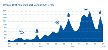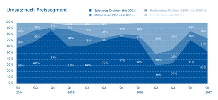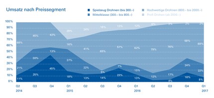 On retrouve aussi des différences saisonnières pour les ventes par segments de prix: à Noël, les drones-jouets dont les prix vont jusqu’à 300 francs sont particulièrement appréciés. En été, ce sont des drones de qualité supérieure, dont les prix se situent entre 800 et 2000 francs, qui sont les plus demandés. «Je suppose que cette tendance s’accentuera encore cette année», dit Blijdenstein. En été et en automne 2016, les acheteurs en ligne suisses ont déjà acheté plus de drones de qualité que de drones-jouets.