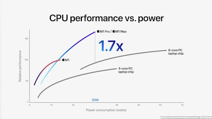 Maintenant, s’il y a un cas d’utilisation comme celui d’un éditeur vidéo, alors il est possible que la M1 Pro ne soit pas assez rapide. C’est à ce moment-là que la M1 Max est censée intervenir. Elle est encore plus rapide que la M1 Pro, déjà plus rapide, qui à son tour est plus rapide que la M1 actuelle, qui est définitivement plus rapide que la concurrence. Du moins, c’est ce qu'on peut entendre dans l’émission d’Apple.