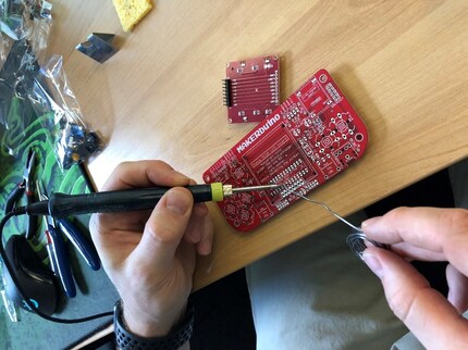 La première étape consiste à souder le processeur et l'écran. Les points de soudure sont marqués pour que vous ne vous trompiez pas. Ne vous inquiétez pas : il y a suffisamment d'espace pour les soudures. Ainsi, la carte est également adaptée aux débutants ou aux personnes comme moi qui ne sont pas très fortes en soudure.