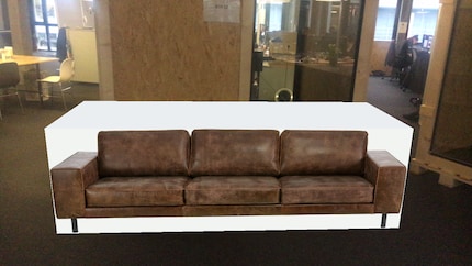 Canapé.Nerf-Gun, une fois en vrai, une fois projeté.La fonction a besoin des dimensions sur produit (HxlxP) pour pouvoir le projeter correctement dans la pièce. Une image frontale du produit est également nécessaire. Vous pouvez aussi choisir d’autres photos pour, par exemple, voir le dos de l’objet si vous vous déplacez dans la pièce. Si les dimensions manquent, vous pouvez les entrer manuellement.