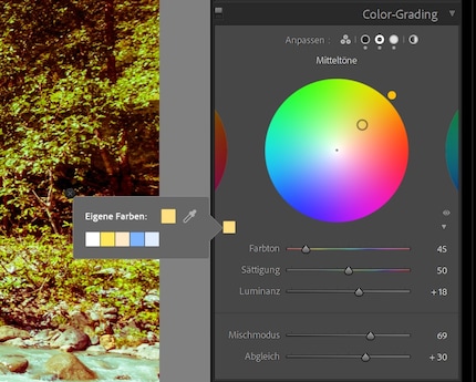 La principale nouveauté de Lightroom est la fonction Color-Grading. Elle remplace l'ancienne fonction Teintes partielles. Outre les ombres et les lumières, il est désormais possible de colorer séparément les tons moyens. Ou tout à la fois. De plus, davantage d'options sont disponibles. La teinte et la saturation sont sélectionnées à l'aide d'un curseur, du cercle chromatique ou d'une pipette. De plus, vous pouvez régler la luminance, le mode de mélange et la balance.